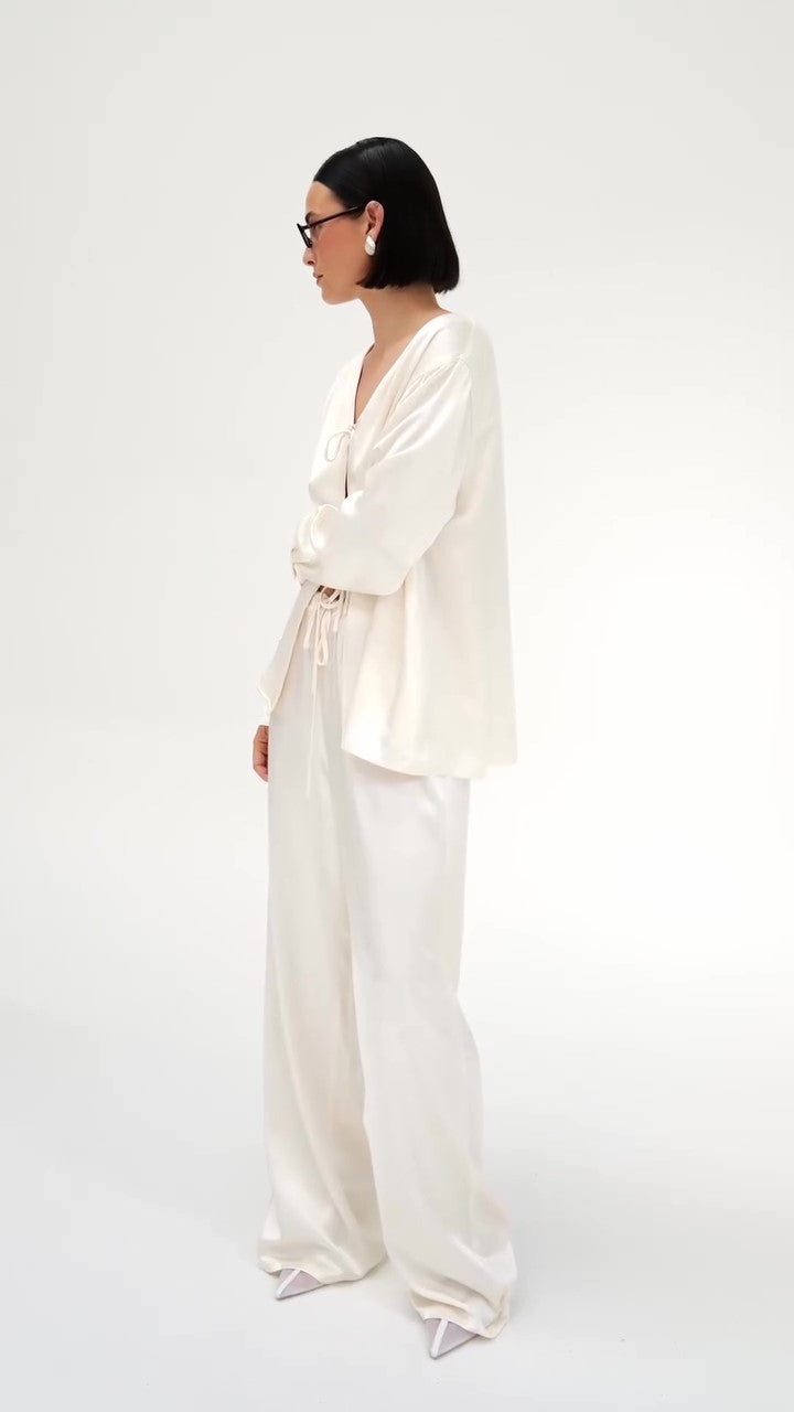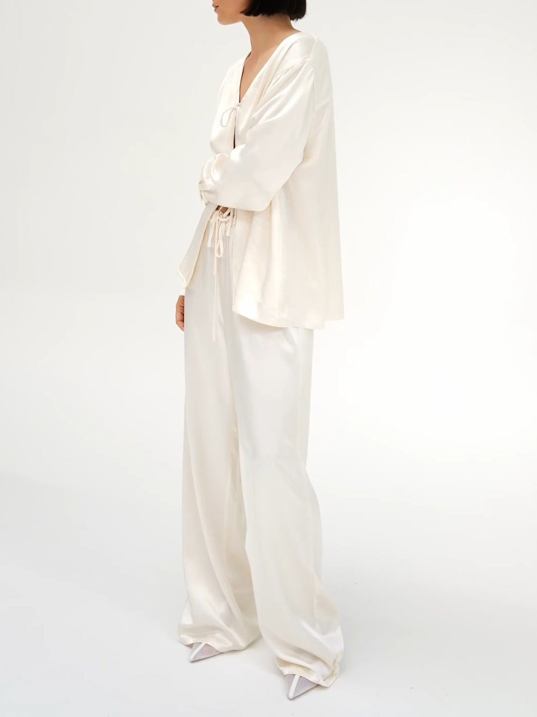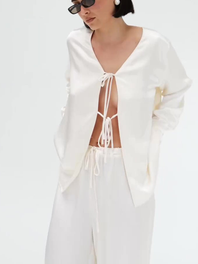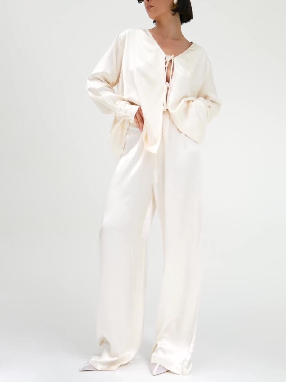 क्रीम रंग का सैटिन टाई-फ्रंट टॉप और वाइड-लेग पैंट का सेट